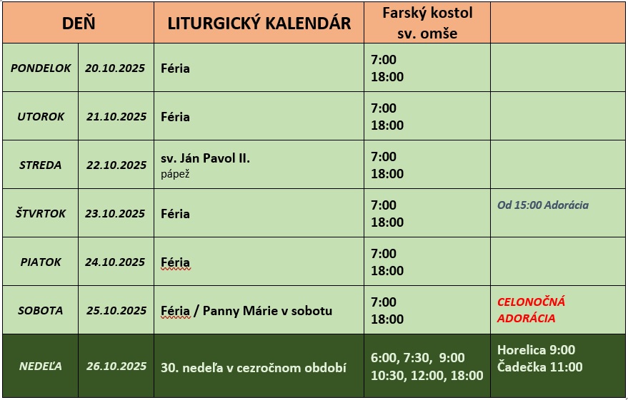 Duchovná príprava pred Slávnosťou všetkých svätých a Spomienke na zosnulých zo soboty (25.10.2025) na nedeľu (26.10.2025) po večernej sv. omši po celú noc až do rannej sv. omše bude celonočná Adorácia spoločenstiev.