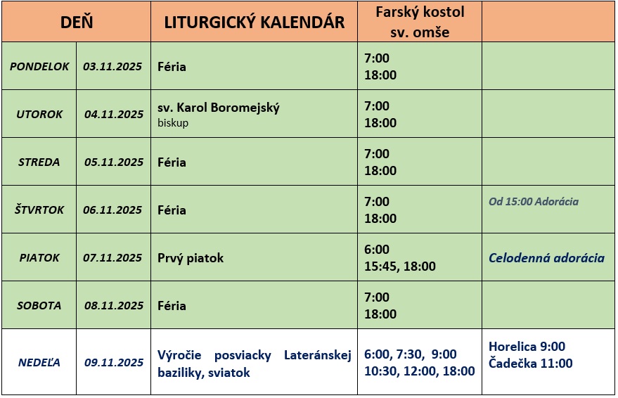 V tomto týždni, je prvý piatok v mesiaci. Budeme spovedať ako obvykle pol hodiny pred sv. omšami a v piatok od 15:45 do 18:00. prosíme využite možnosť sv. spovede počas celého týždňa.