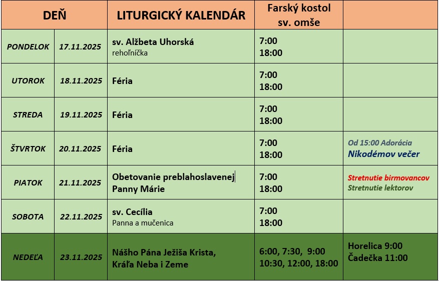 Na budúcu nedeľu je slávnosť Nášho Pána Ježiša krista, Kráľa Neba i Zeme (Krista Kráľa) – po sv. omšiach bude pobožnosť zasvätenia ľudského pokolenia Najsvätejšiemu Srdcu Ježišovmu.