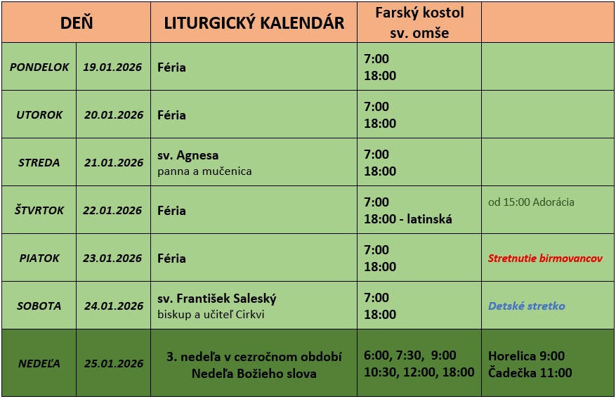 Stretnutie birmovancov bude tento piatok 23.01.2026 po večernej sv. omši v Pastoračnom centre. Birmovancov pozývame aj na sv. omšu.