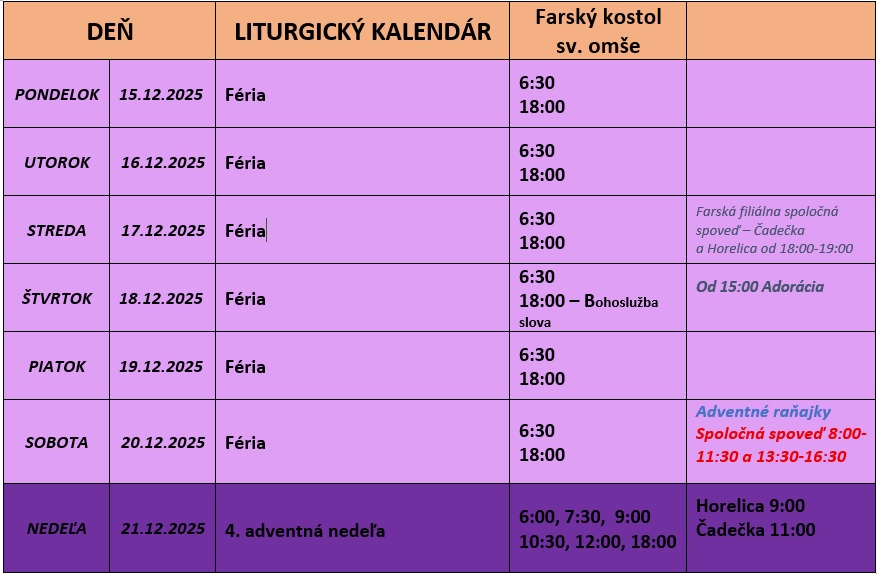 - Pondelok 22.12.2025 od 8:00 – do 11:30 a od 13:30 do 16:30 – farský kostol