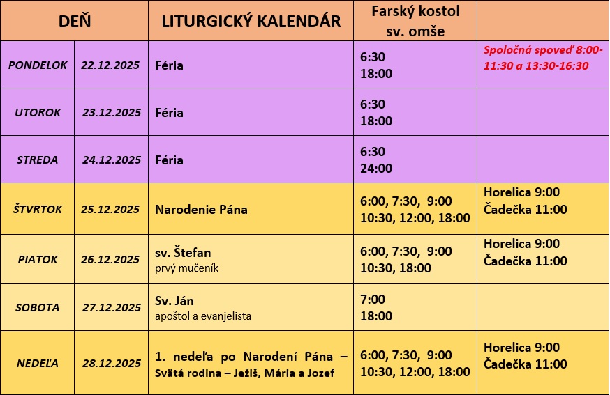 Pondelok 22.12.2025 bude spoločná sv. spoveď od 8:00 – do 11:30 a od 13:30 do 16:30 – farský kostol.