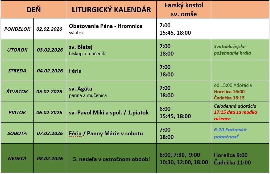 K chorým a nevládnym po domoch po domoch a bytoch pôjde pán dekan v piatok. Z dôvodu choroby kapláni posúvajú spovedanie svojich chorých o týždeň neskôr. Pán kaplán Matúš bude chodiť k chorým na Žarci až v utorok 10.02.2026 doobeda a na Horelici vo štvrtok 12.2.2026. Pán kaplán Štefan navštívi svojich chorých 11. a 12. 02.2026 (streda, štvrtok budúceho týždňa).