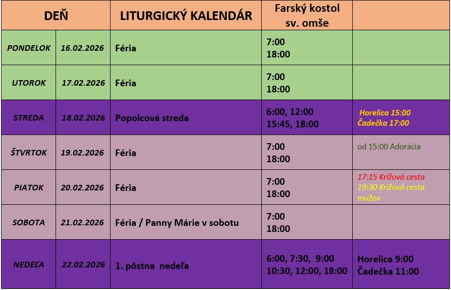 Je deň pokánia v celej Cirkvi. Pri sv. omšiach bude značenie popolom. Ranná sv. omša bude o 6:00. Pripomíname, že v stredu je deň prísneho pôstu a zdržiavanie sa mäsitého pokrmu. Pôst v tento deň nie je možné nahradiť iným skutkom pokánia. Pôst znamená iba raz do dňa sa dosýta najesť, pričom možno prijať trochu pokrmu ešte dvakrát v priebehu dňa.