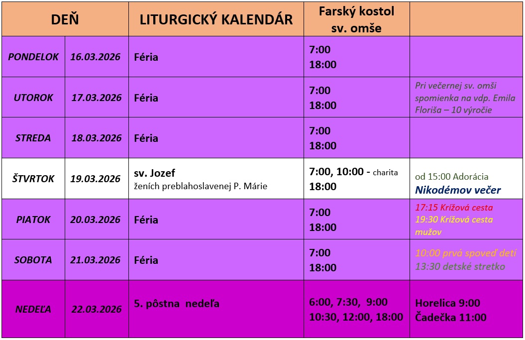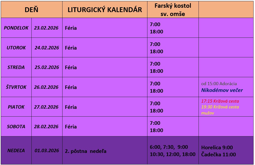 - Horelica – nedeľa 8:00 a v piatok 16:00