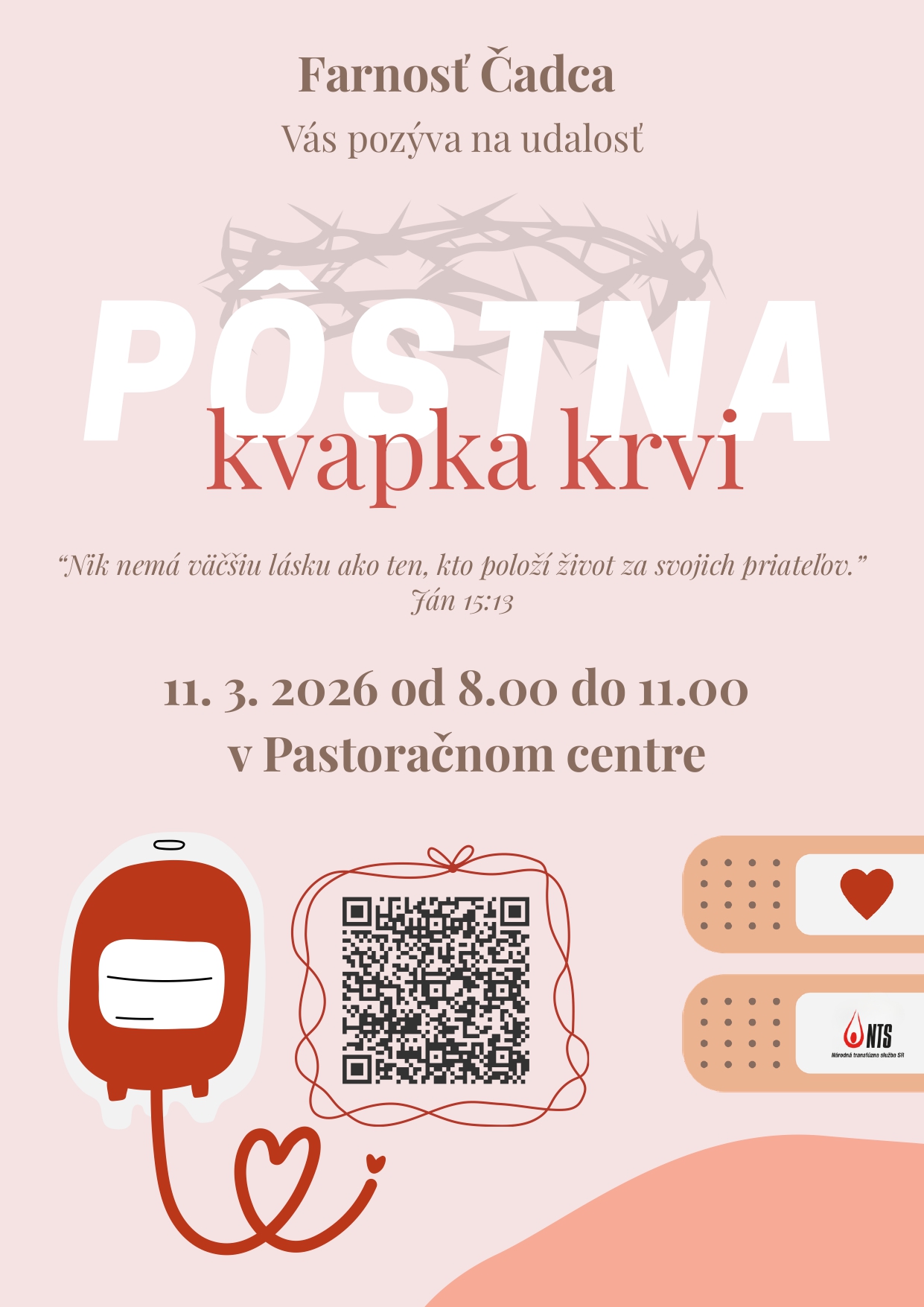 Srdečne vás pozývame na pôstnu kvapku krvi, ktorá sa uskutoční v stredu 11. marca 2026 v pastoračnom centre. Darovať krv môže každý človek vo veku 18 až 60 rokov, ktorý váži viac ako 50 kg. Vaša krv môže zachrániť život. Každý darca je veľkým darom pre tých, ktorí to najviac potrebujú.