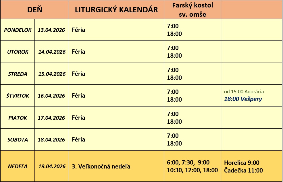 Pokiaľ sme prítomní na fare, sme vám k dispozícii kedykoľvek počas dňa. Okrem toho sa snažíme byť k dispozícii najmä po sv. omšiach, teda v tomto čase: